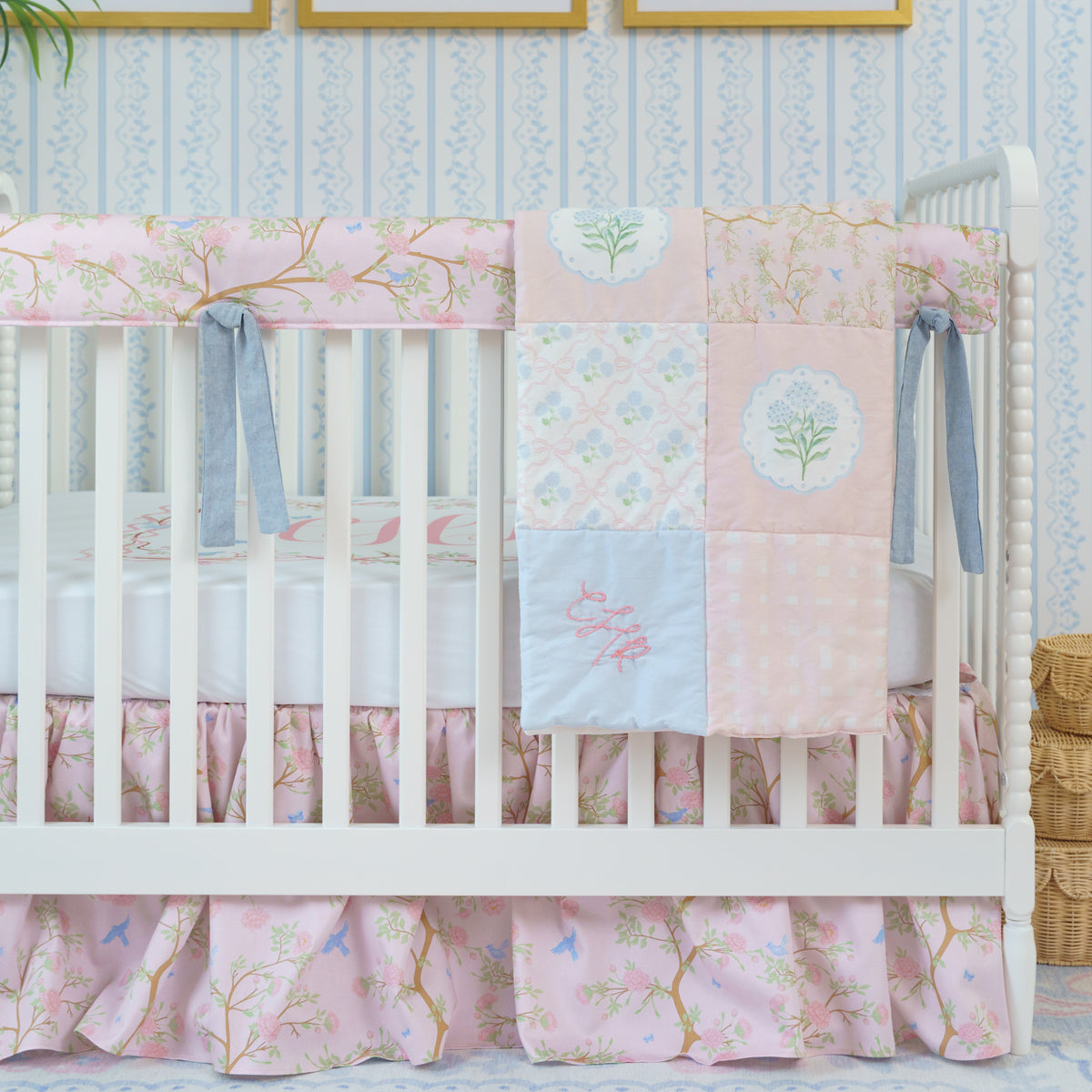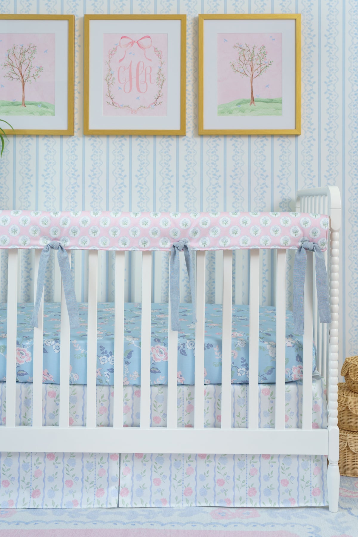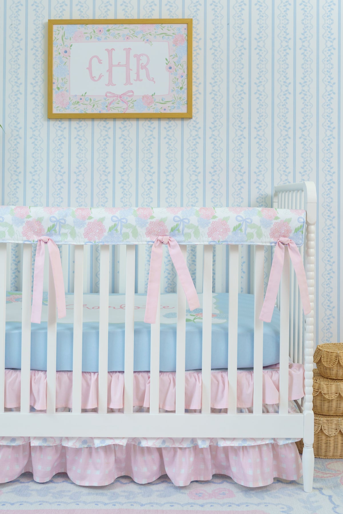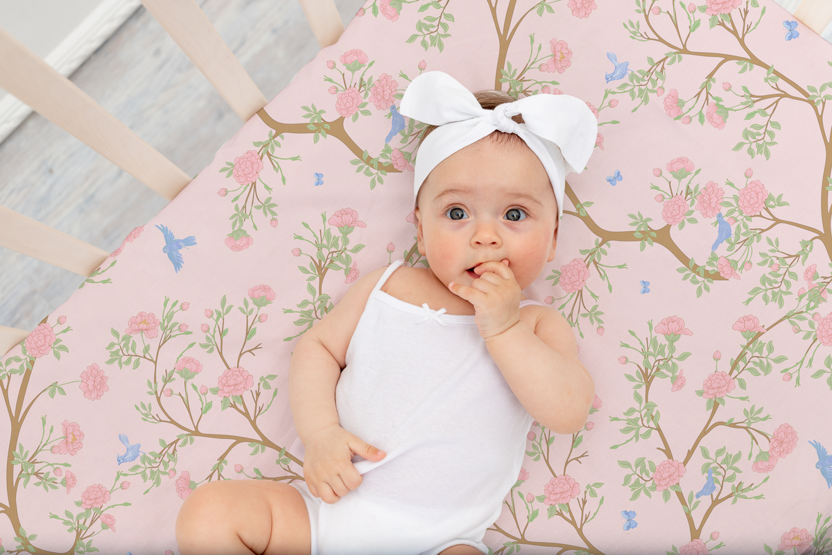 Our nursery textiles are designed in-house and crafted right here in the USA by our small but mighty sewing team. Every bow, stitch, and scallop is made with love (and a serious eye for detail). PS: diaper bags are the one exception—they’re globally sourced, but always chosen for quality and durability.