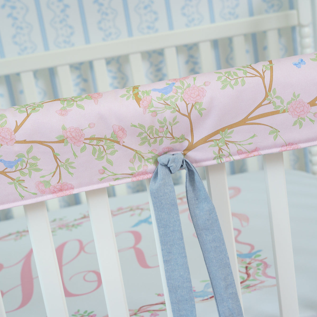 Our nursery textiles are designed in-house and crafted right here in the USA by our small but mighty sewing team. Every bow, stitch, and scallop is made with love (and a serious eye for detail). PS: diaper bags are the one exception—they’re globally sourced, but always chosen for quality and durability.