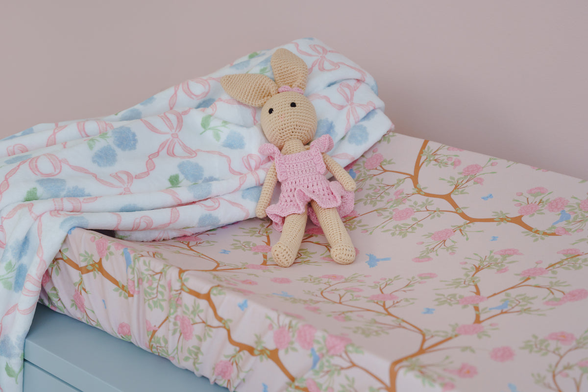 Soft, lightweight, and made for everyday snuggles — our Preppy Heirloom minky blanket is a baby essential with a polished twist. Choose from Chinoiserie Garden, Ribbon Trellis, French Blue Floral, or Pink Hydrangea Medallion, each one made with our plush minky fabric for a cozy feel and a timeless look. Perfect as a baby shower gift or as part of a coordinated nursery set, you’ll want more than one.