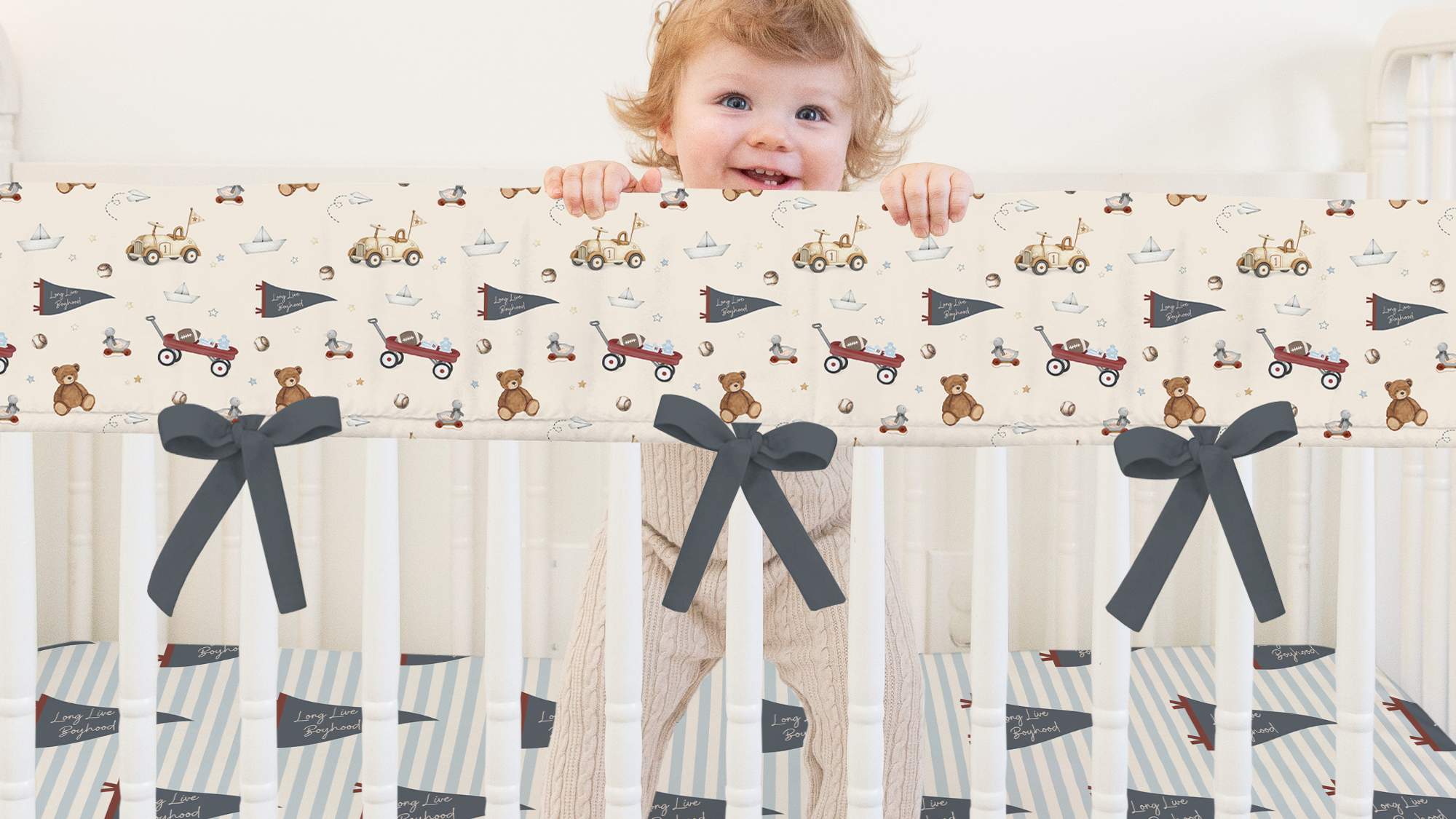 Long Live Boyhood celebrates the spirit of boyhood—where vintage sports, playful patterns, and timeless stripes come together in a warm, nostalgic palette. Thoughtfully designed to feel classic yet youthful, each piece layers effortlessly to create a nursery that feels collected, cozy, and full of childhood charm. It’s a refined take on sporty nursery style, made to grow beautifully with your little one.