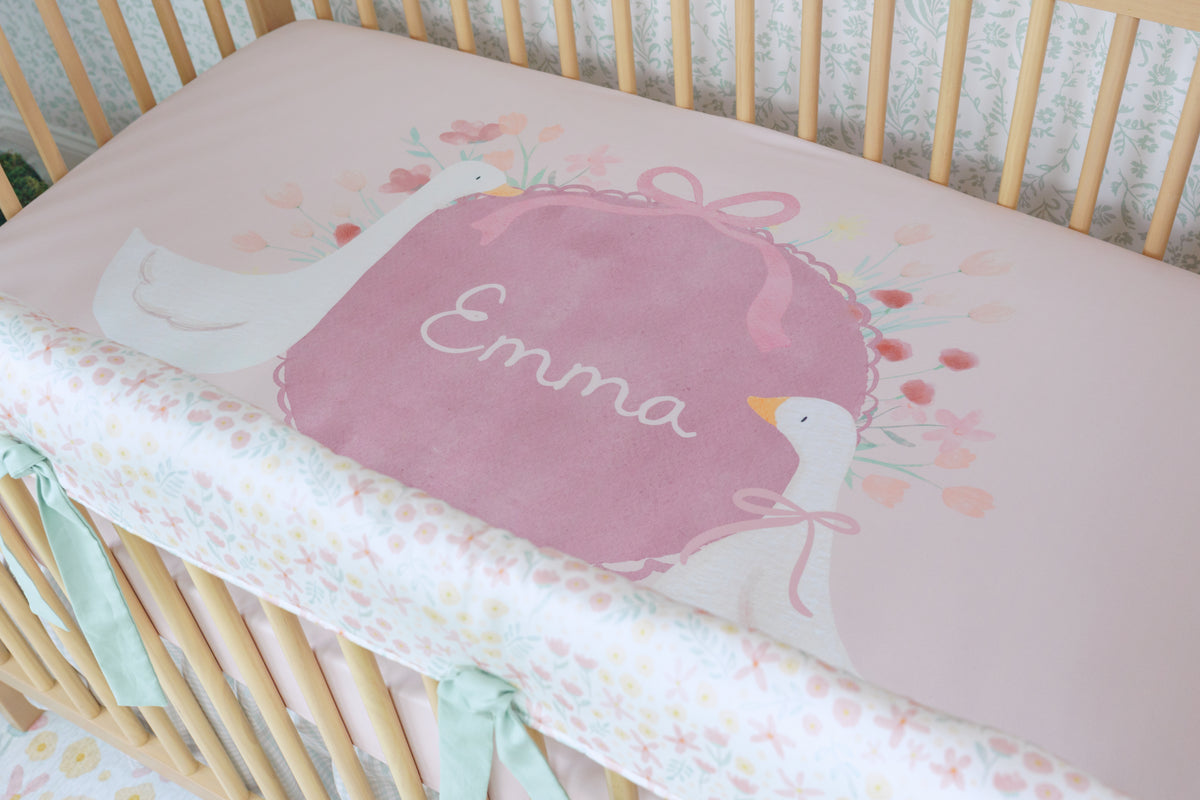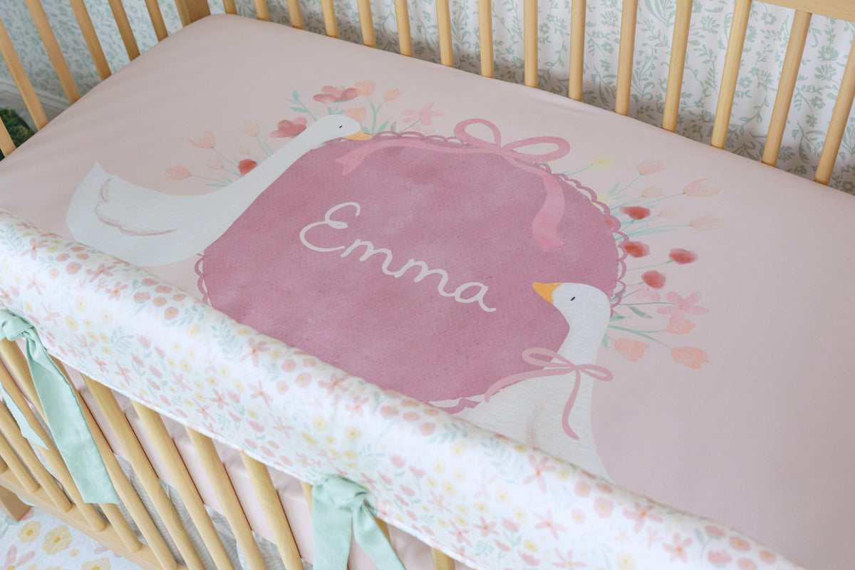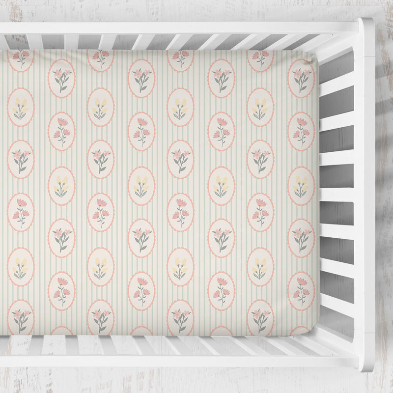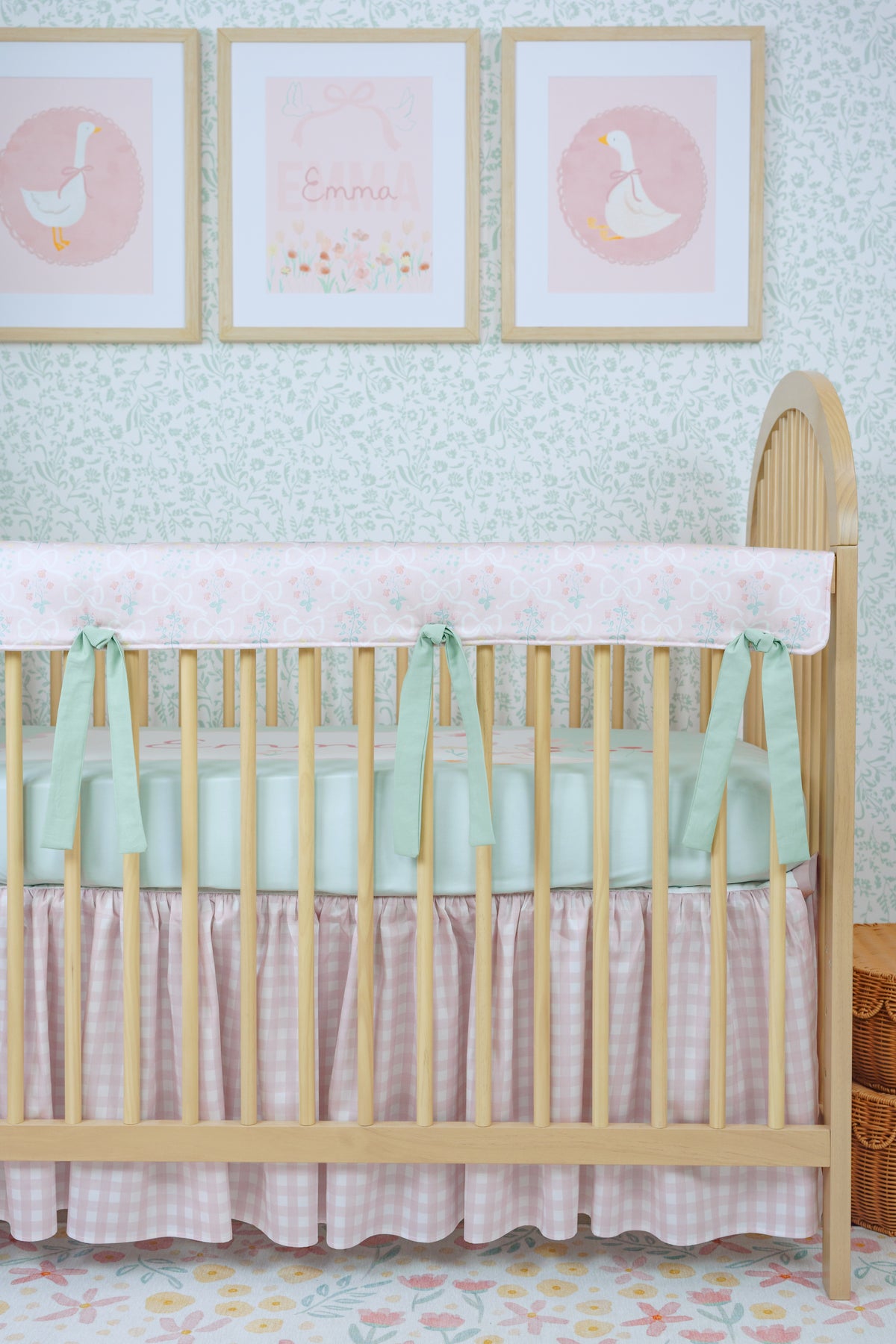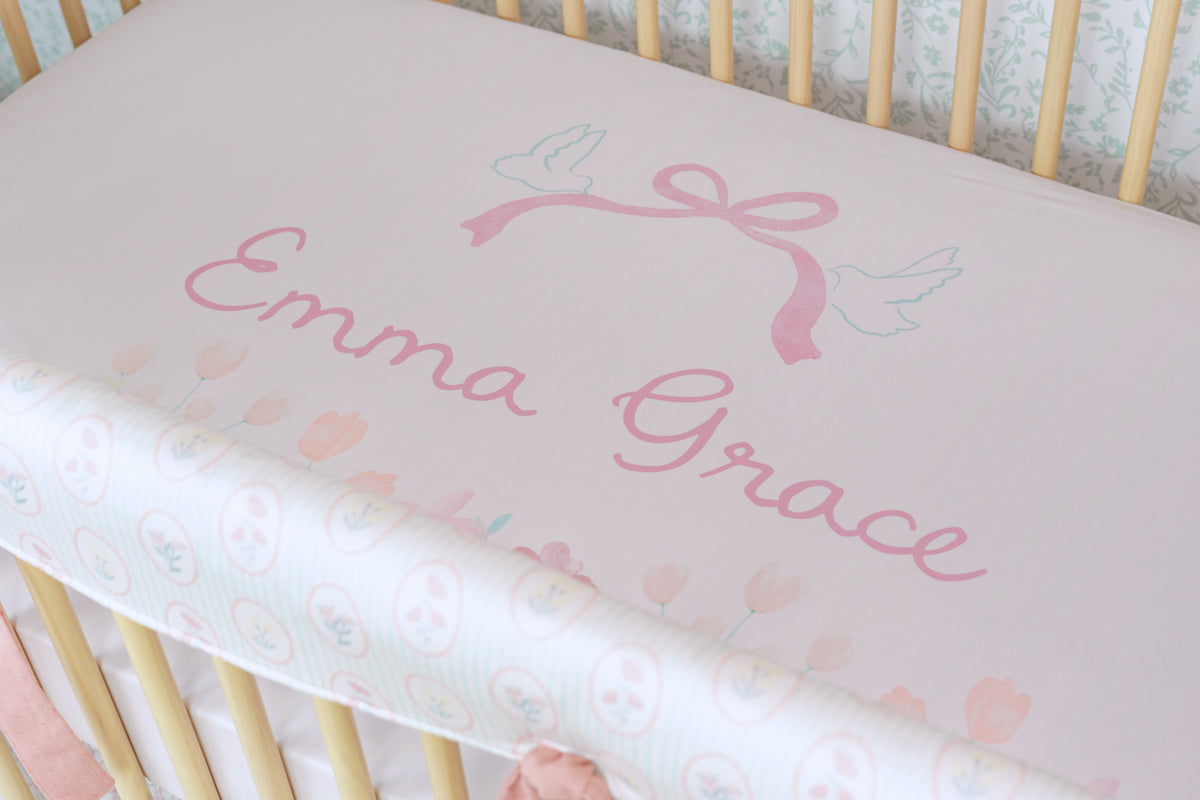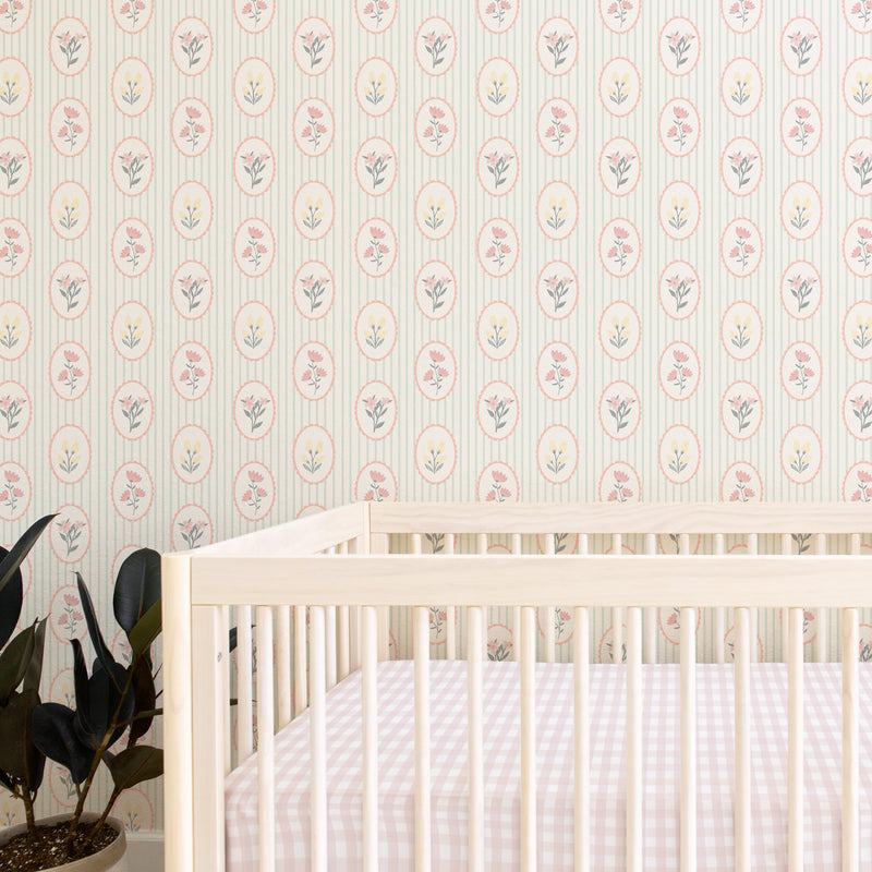 With its delicate floral medallions and soft vintage tones, Garden Cameo brings a touch of timeless charm to the crib. This elegant, heirloom-inspired print is the perfect blend of structure and sweetness—adding a graceful, romantic feel to your nursery while protecting your crib in style. Finished with ties in our Sunset Rose x Chambray Linen, the subtle woven X’s add texture and charm for a truly thoughtful finishing touch.
