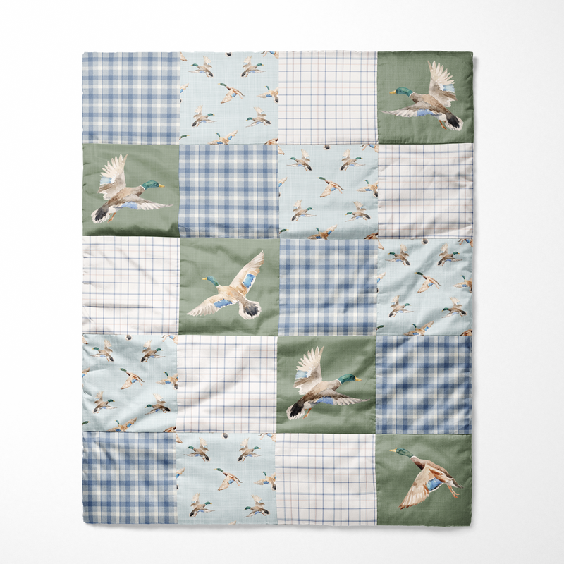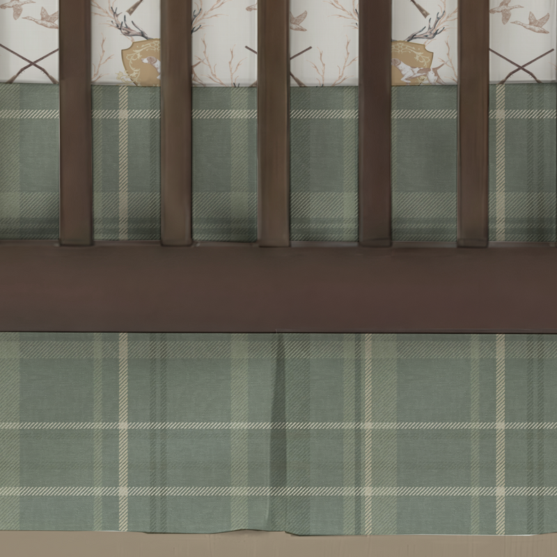Hand-illustrated field scenes unfold in soft blue tones, featuring retrievers, ducks, and classic countryside detail. Refined and nostalgic, Hunting Toile — Blue brings a hint of sporting tradition to the crib while keeping the look light, airy, and timeless.