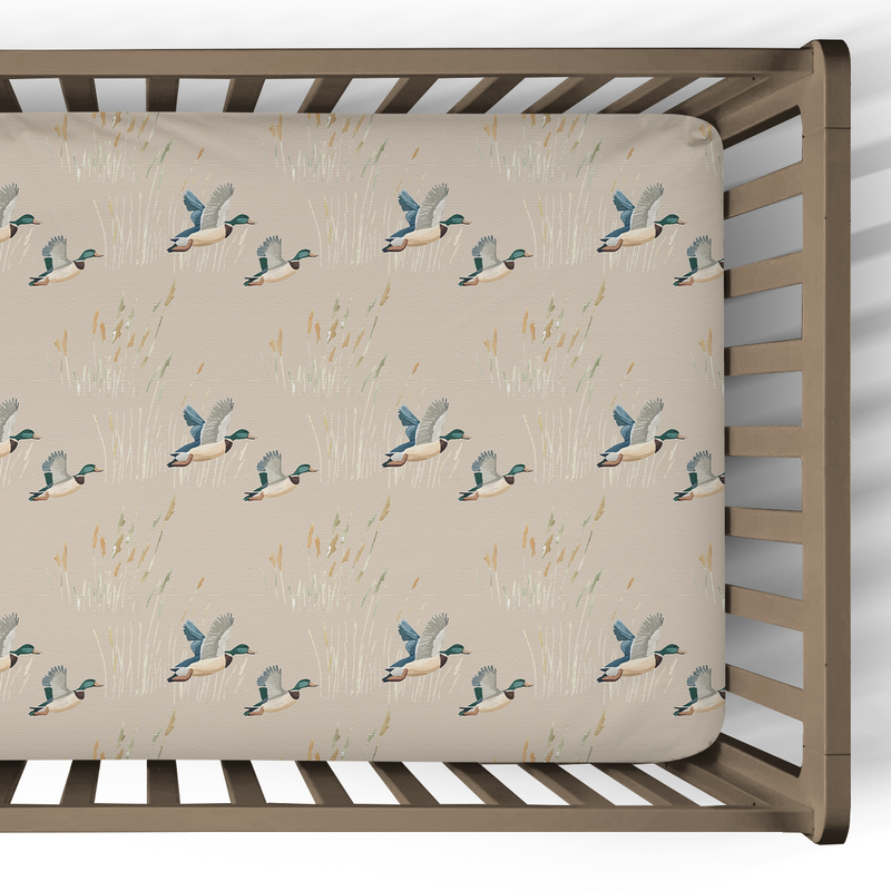 Soft neutrals and gentle cattails set the scene for hand-illustrated ducks in flight, creating a calming, countryside look inside the crib. Timeless and quietly refined, Marshland Ducks adds a subtle sporting touch while pairing effortlessly with the rest of the Mallard & Moss collection.