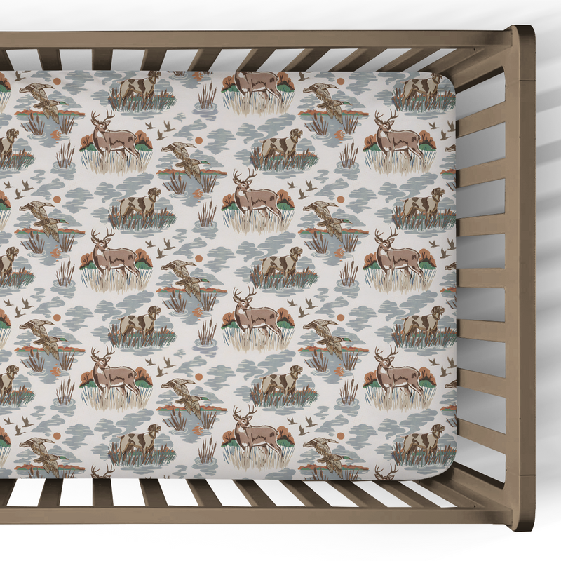 A classic scene of retrievers, ducks, and deer surrounds baby’s name, creating a cozy crib moment inspired by field tradition.